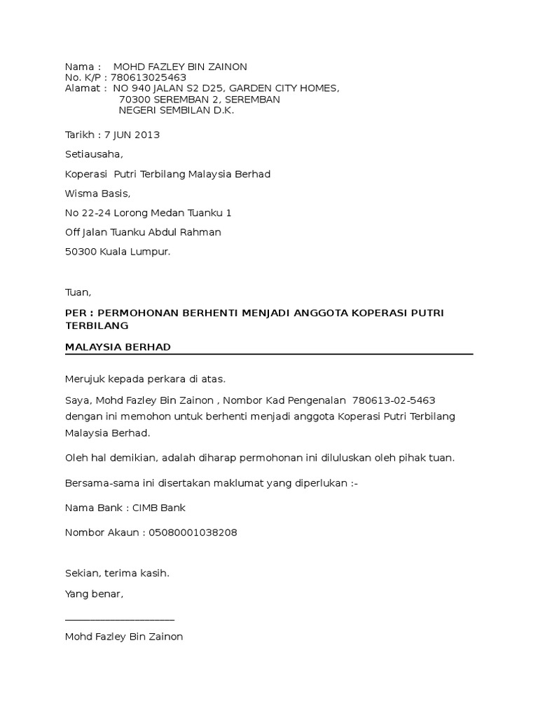 Contoh Surat Pemberhentian Ahli Koperasi Letter 7saudara Com
